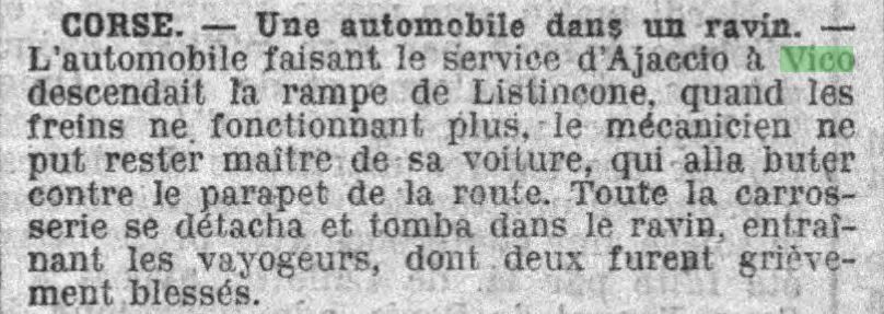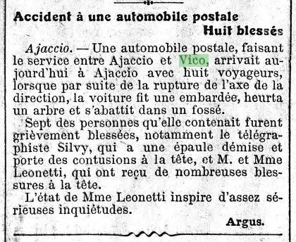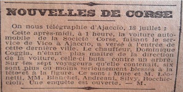 Le 18 juillet, vers 13 heures, le car transportant le courrier et sept passagers entre Vico et Ajaccio cassa son axe de direction à l'entrée de la ville. Le chauffeur, Dominique Coggia, ne put éviter de heurter un arbre. Il y eut six ou sept blessés, selon les journaux. Oui, "selon LES journaux", car la nouvelle fut répercutée, non seulement par les journaux corses mais aussi par de nombreux quotidiens continentaux.