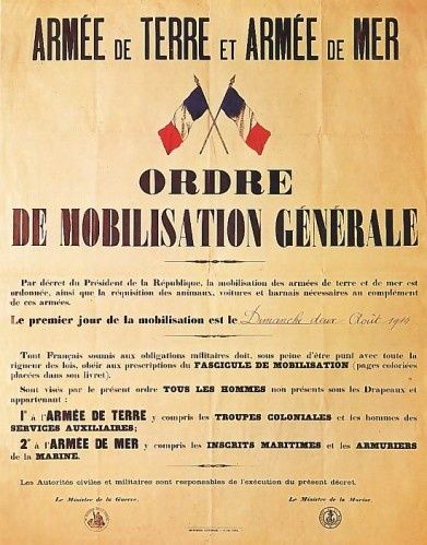 Suite à l'assassinat de l’archiduc autrichien François-Ferdinand à Sarajevo, un mois plus tôt, le 28 juin 1914, le gouvernement français décrèta la mobilisation générale samedi 1er août à 16 heures, avec effet le dimanche 2. Tous les clochers de France firent entendre un sinistre tocsin. L'Allemagne déclara la guerre à la France le 3 août.