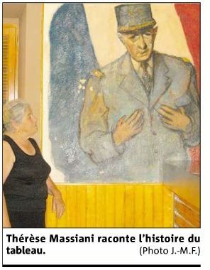 "A Orto, dans l'établissement de Thérèse Massiani, où les habitants aiment à se retrouver après le travail, Charles de Gaulle depuis 1958, en son costume de général, assiste impassible à toutes les discussions, chants, soirées jeux de société et autres. Comment le libérateur de la nation peut-il trôner dans un petit village de montagne? Thérèse a bien voulu 51 ans après et pour la première fois nous raconter avec passion l'histoire de cette peinture.