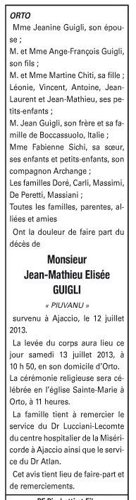 La levée du corps aura lieu ce jour samedi 2 mars 2013 à 14 h 30, en l'espace funéraire Picchetti, les collines du Vazzio, Ajaccio.